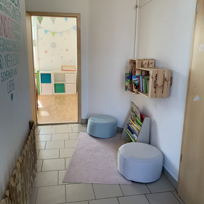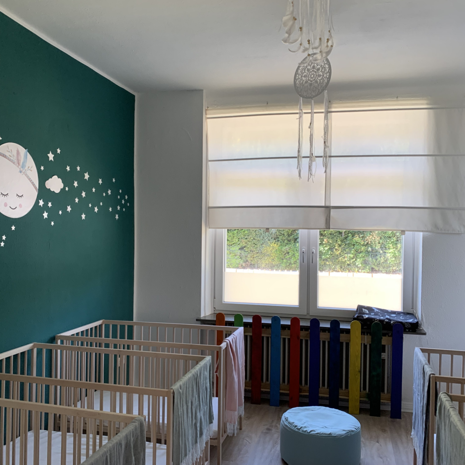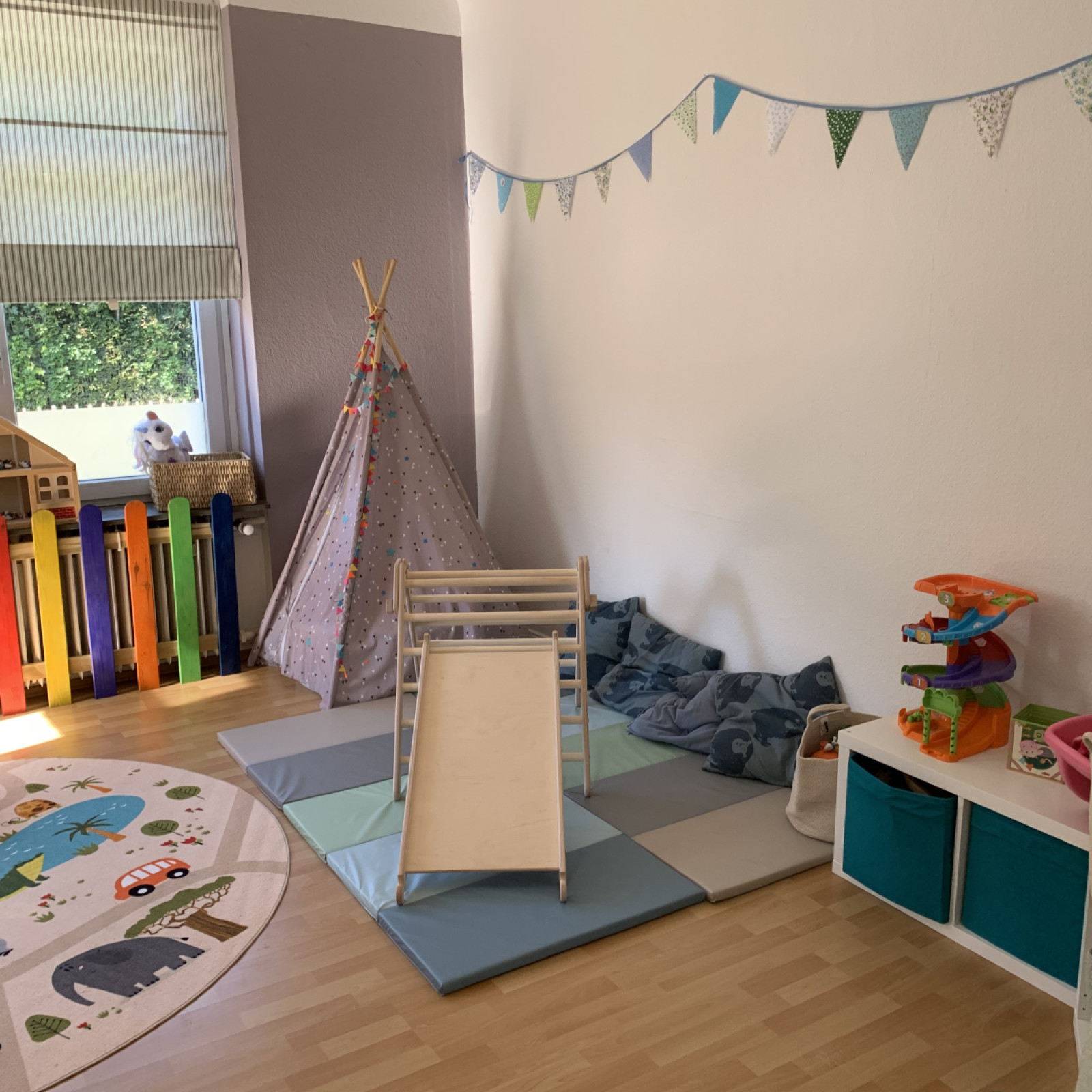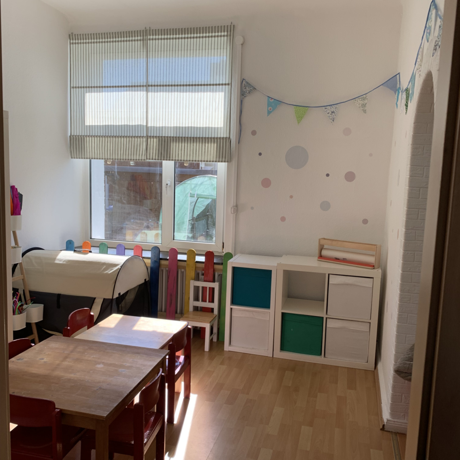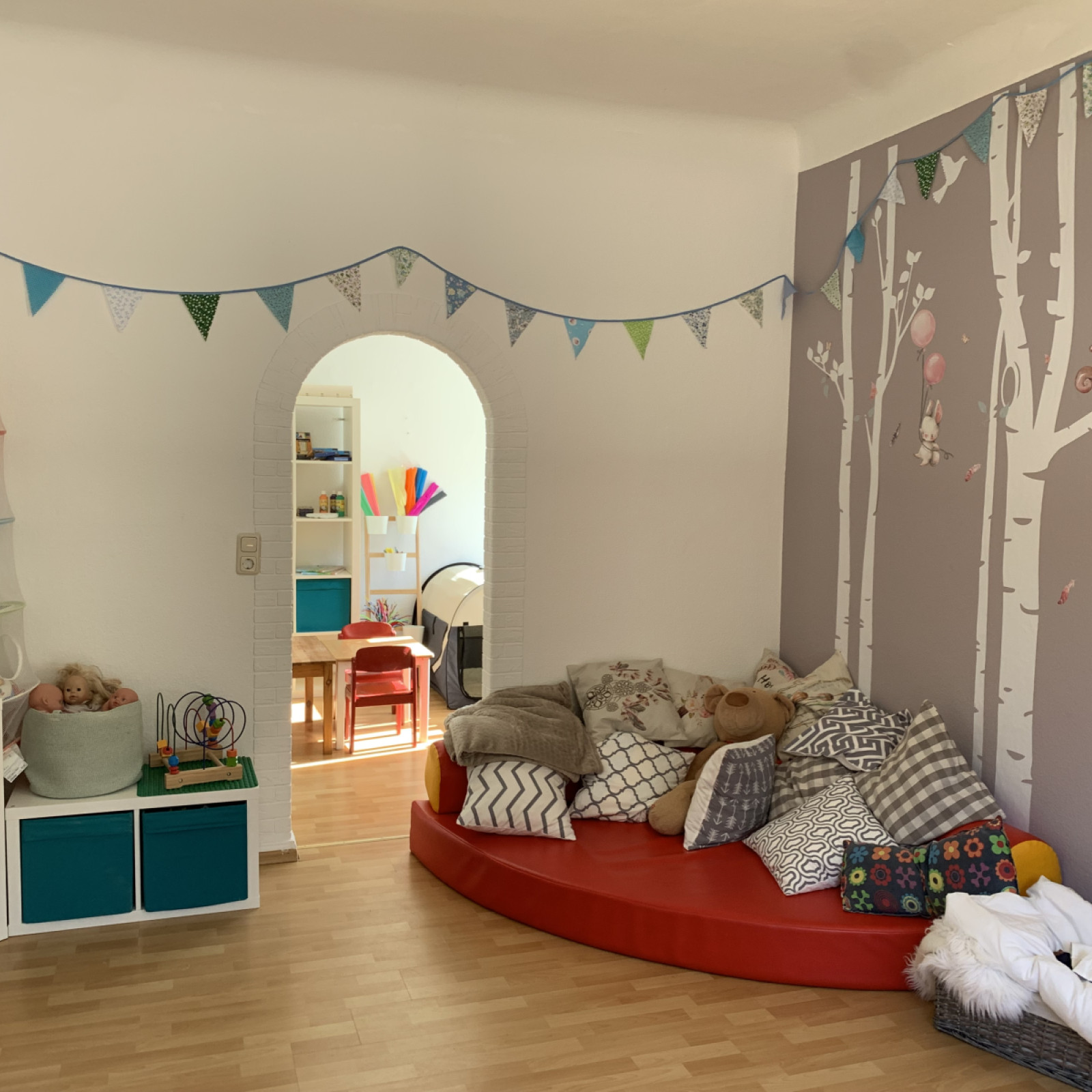 Für den Mittagsschlaf oder um sich auszuruhen gibt es den Schlafbereich mit einem eigenen Bett für jedes Kind. Die Küche ist besonders wichtig: hier bereiten wir – auch oft gemeinsam mit den Kindern – die Mahlzeiten zu und lassen es uns zusammen am großen Tisch schmecken. In den Räumen gibt es verschiedene Bereiche zum Basteln oder Spielen – mache Bereiche werden auch für verschiedene Anlässe umgeräumt. In den Räumen wird natürlich nicht geraucht.